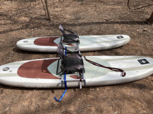The “kayakamaran”, as we call it, is basically two kayaks or paddle boards, connected by an aluminum loading ramp via tie straps. We have a 16lb 50 amp hour battery and 30 lb thrust trolling motor. I think we have gained a few pounds because it is so luxurious compared to the labors of paddling.